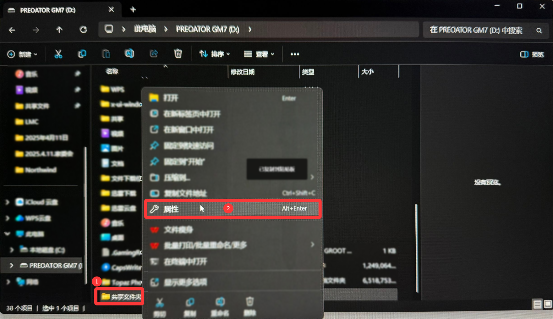 创建好后,鼠标右键点击共享文件夹,找到“属性”并点击。